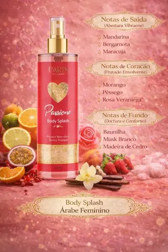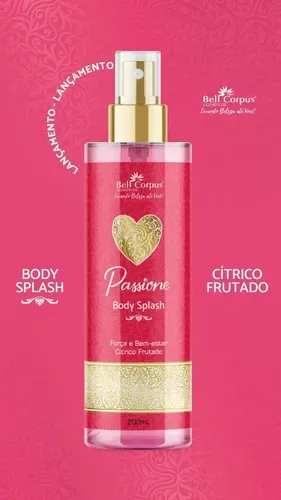 Body Splash Paixão Frutada: fragrância envolvente em spray, ótima para o dia a dia e ocasiões especiais. Leve, suave e de longa duração, deixa a pele perfumada sem exageros. Embalagem elegante em tons de rosa com detalhes dourados, prática para levar na bolsa. Aplique após o banho ou antes de sair para completar seu look. Conteúdo: 200 ml.